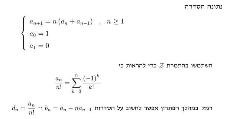 אני מכיר גם את השאלה ששאלת עכשיו-אל תתרגש ממנה זה כמו משחק של "בובות רוסיות"(הבובות האלה שאתה פותח אותן ויוצאת בובה יותר קטנה וכו) , בעזרת ההדרכה(שאגב במבחנים הן לא תמיד עוזרות ובפקל פותרים לפעמים הרבה יותר אלגנטי ופורמלי), שלב ראשון בסך הכל זה לכתוב את המשוואה של A_n, בדיוק כמו בפקל, עם הכתיב של הדלתא אתה זוכר זה שקול. אחרי זה כל מה שעשו זה לפתוח סוגריים ובכוח להעביר אגפים עם מוטיבציה להגדיר b_n ואז אחרי שעשו את זה זה ממש משוואה רקורסיבית רגילה קלה , מוצאים את b_n בדיוק כמו בפקל, אבל אז המשחק של הבובות הרוסיות ממשיך אתה עובר לשלב הבא בהדרכה, לבובה יותר קטנה ובכוח מחלק בעצרת כדי לקבל את d_n ואז גם עבורו מקבלים משוואה קלה ולסיום בגלל שכל ההבדל בינו לבין הסדרה A המבוקשת זה עצרת, אז סיימנו.
