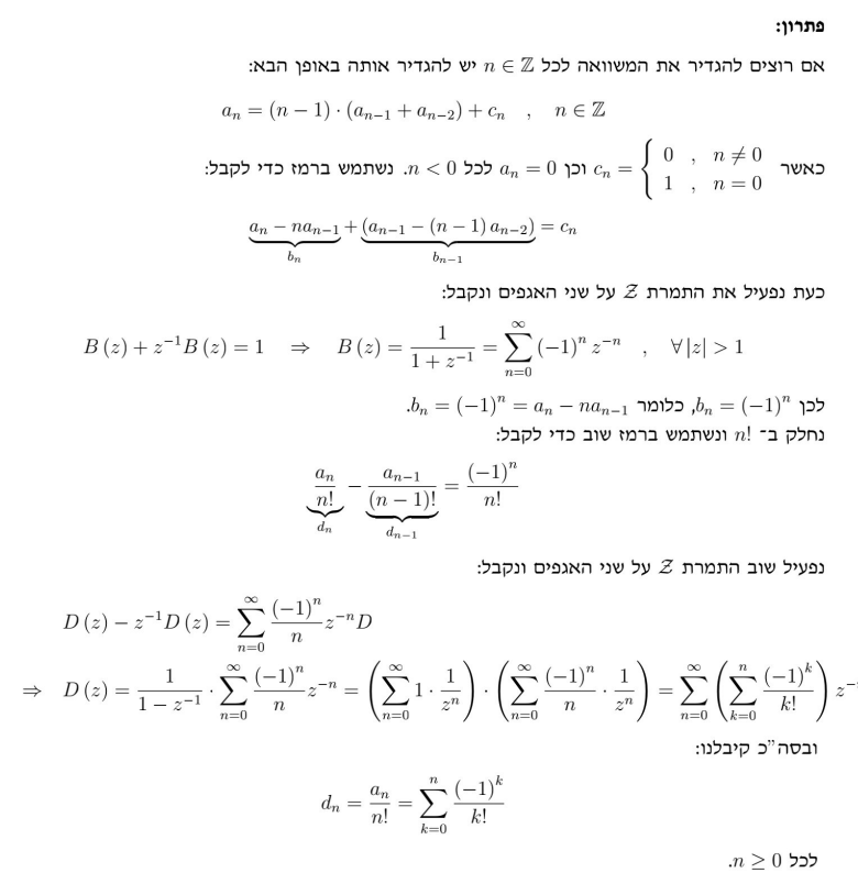 מנסיון שלי והכרות עם צוות הקורס, אם תהיה התמרת Z במבחן, המקרה הכי "מעניין" שיופיע במבחן הקרוב בסמסטר הזה זה משוואה רקורסיבית עם פולינום ממעלה שלישית במכנה כמו שעשינו בפקל. פשוט לוודא שאתה יודע לפתור משוואה רקורסיבית בדיוק כמו בפקל כי זה שמביאים במבחן אם שיש התמרת Z, לפתןר משוואה רקורסיבית.