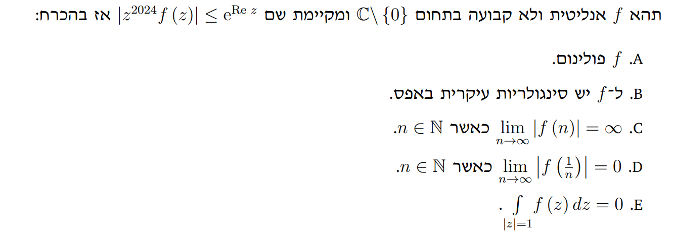 שלום רב, רציתי לשאול לגבי דרך הפתרון של השאלה המצורפת: האם זה נכון להגדיר פונקציה חדשה שהיא אף *אקספוננט במינוס זד* זד בגובה 2024 ואז מהנתון לומר שהפונקציה חסומה בסביבת 0 וניתן לעשות לה השלמה אנליטית ומשם שימוש בליוביל?